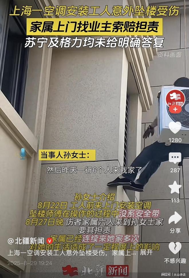 最近,上海的一名妇女在购物中心购买了空调。安装空调后,老师突然从上层掉下来,移至ICU。鉴于高昂的医疗费用,老师的家人找不到相关部门,因此他们困扰着妇女承担责任。老师和工人在工作时从建筑物上摔下来,一家人到达了所有者以确认赔偿。这名妇女受到了不公平的对待:卖方答应安装包裹,我不知道老师邀请了谁。发生了什么?根据8月29日的媒体报道,Sun的房屋与空调一起定居,但老师意外倒塌了。但是,尽管受害人的家人因赔偿而困扰着SAN,但该品牌的购物中心表现“隐形”。桑不能返回家园,受害人的家人每天都要求您的房屋并承担责任。她真的感到不公平。这个问题必须从Augu开始ST22。Sun购买了两个在大国大型购物中心的著名品牌。商人承诺,这将是“交付和安装”,但不太担心。那天下午,三名装置工人从一侧开始工作,圣米洛(Saniró)从一侧进行了安装,以为它在安装空调后会平静下来。但是过了一会儿,突然陷入困境的“打击”,吓到了。桑想说他应该对自己的安全保持小心,但是当她转身时,她注意到老师失踪了,围栏悬挂在空气中。他迅速跑到楼梯上,当他到达楼梯时,他看到主人负责在身体上安装一个外部单位,即使安全带也被发现在地板上。塞恩斯(Sainthe)加快了120,并立即向警察寻求帮助,希望老师安全健康。后来,桑发现,怀疑老师的骨折,我一直在治疗它n ICU,他的病情不是很好。但是我没想到的是问题仍在前进。 8月27日晚上,8月27日,一群受伤的六名成员(包括1980年代受伤的父母)去了圣殿,并说受伤的人仍在重症监护室中,而太阳能烧伤和欢乐合唱团不在乎。事故发生在SAN的房屋中,她必须承担责任。当时,桑(San)遭受了痛苦和无助。我也是受害者。老师是由商人派遣的,那为什么来找我呢?但是,家庭尚未听到解释。几天后,他来了,他的家人不安,他的正常生活受到了影响,有一个我无法回来的家。太阳本人不知道自己是被该品牌雇用还是在购物中心被发现。当我购买空调时,该品牌只说包括安装,但是在请求页面上,购物中心说这是负责任的。不w发生了什么事,当事各方含糊不清,没有一个明确的答案,将其留在中间和困境中。互联网用户正在谈论这个问题。一些互联网用户表示,如果它是Gree的常规安装人员,则他们拥有超过100万个个人事故保险。显然,Suning负责将签名单元的分包合同使用非官方安装程序,Suning维护了负责任的安装单位。从照片来看,他没有穿欢乐合作的工作服。显然,这不是Gree的常规安装程序。这与欢乐合唱团的钱无关!一些互联网用户,我的房子还在今年6月安装了三菱电气。当安装人员到达门时,我首先说两个安装人员必须佩戴安全带,然后将窗户插入窗户,刺穿孔并拧紧螺丝西班牙小吃。安全绳,以避免高度掉落。我支付了高度安装速率100元。何n安装老师正在工作,我总是看着他。我担心这是10,000个差异!一些互联网用户评论说,安装工人应该真正了解安全性。当时,老师来到我家,透露了它而没有绑扎绳子。它甚至吓到我到了我们在五楼(遮住我的脸)的地步。如果我有一个很好的主意会怎样?他不得不与他交谈,担心自己会分心。当时,我不担心如何安装空调。 San为事故中受伤的老师感到难过,但确实不应该对此事负责。从空调空调的位置看,我只能向记者寻求帮助,思考一家人回家的场景。从逻辑上讲,空调是由Sun在购物中心购买的。通常,安装空调的老师是购物中心。除非太阳发现了它,否则老师安装的YS与她无关。薪酬必须由购物中心和品牌进行。受伤的是重症监护病房。一家人可以理解他们是悲伤和悲伤的,但他们没有发现错误的人,也没有扰乱无辜人民的生活。此外,Sun说安装人员的身体没有安全绳。该品牌的客户服务说,普通教师配备了安全设备和perair工作滥用。那么,购物中心的安装老师是随便雇用的,还是老师本人想使用安全设备?无论情况如何,安装老师都负责不认真对待其安全性。当然,作为所有者,由于监督不足,可能有必要支持部分责任。您如何看待这个?